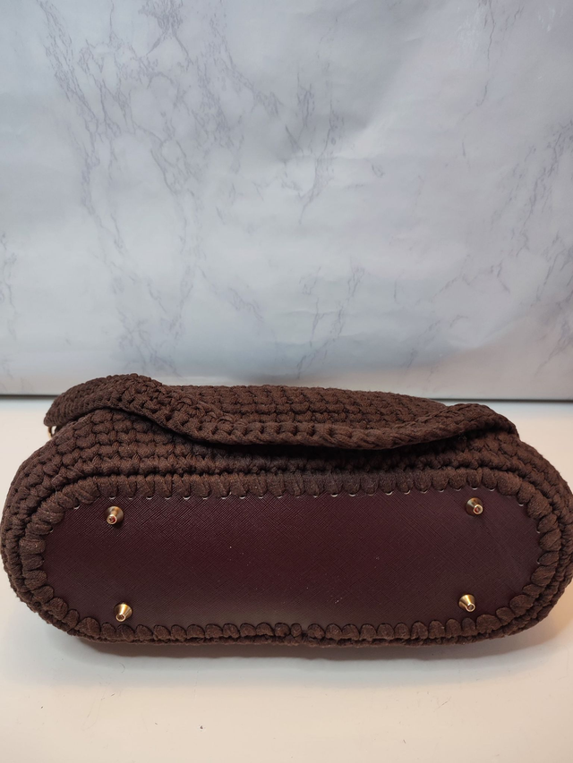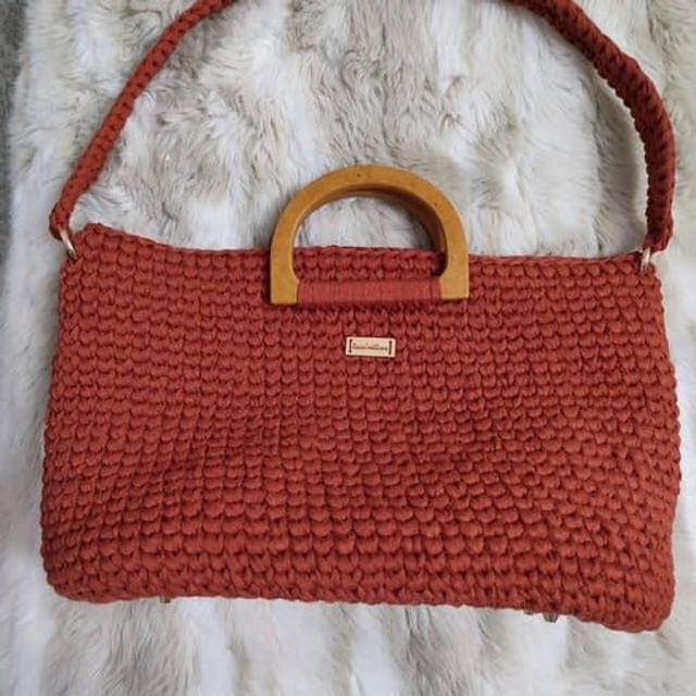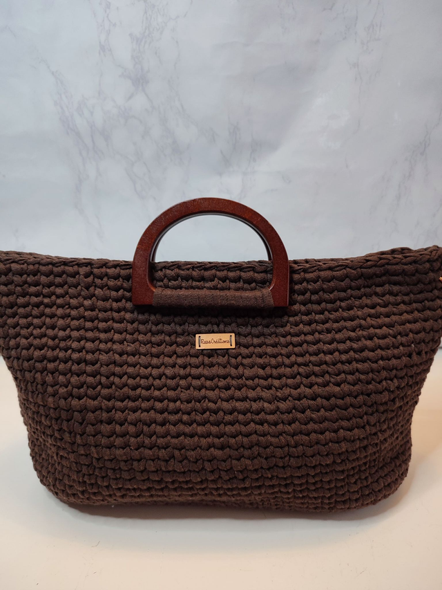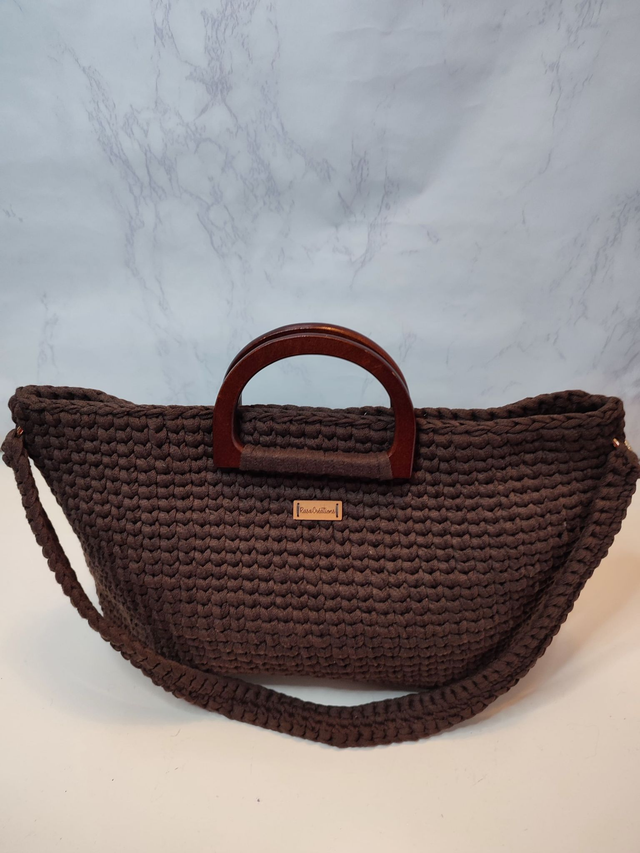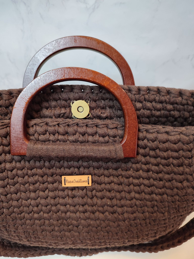 Grand sac, fait main au crochet avec fil coton 100%, largeur 30cm, poignées en bois, fonds cuir PU, lanière épaule.